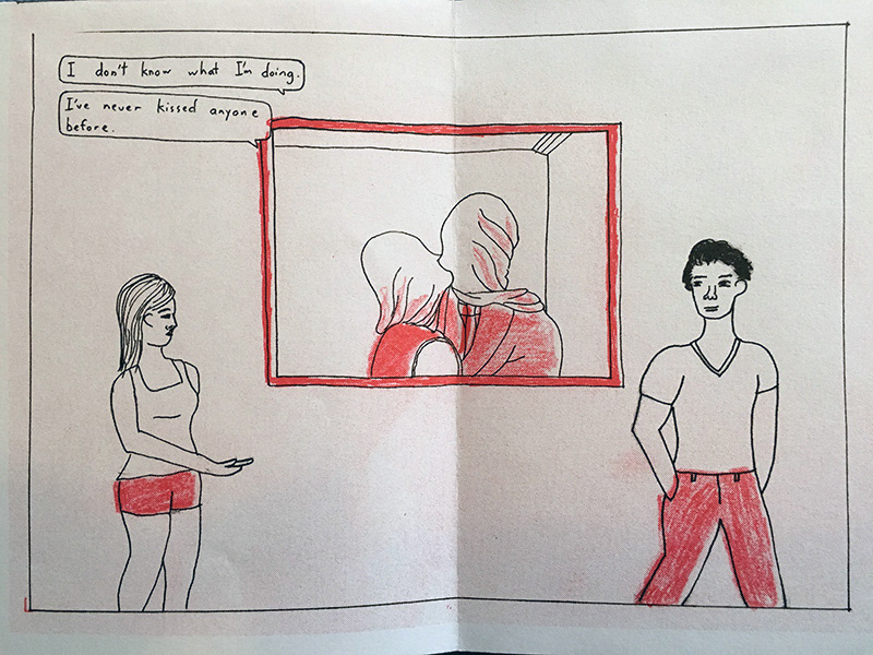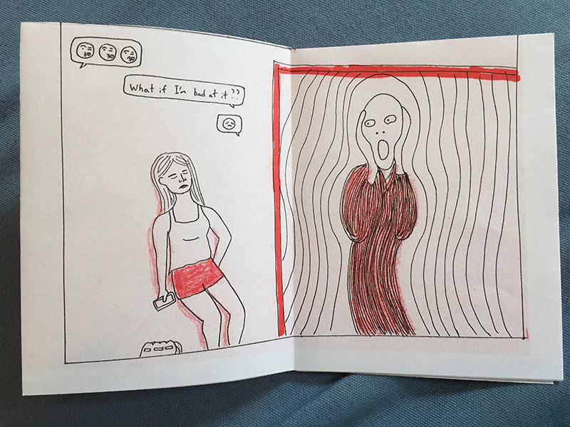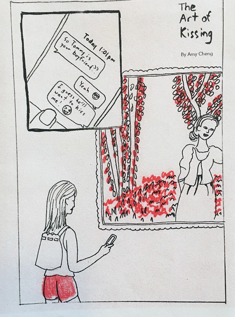 Art of Kissing is a mini-comic about art and kissing for the first time. 6 pages. 4.5” x 5.5”. Two-color Risograph printing. Created by Amy Cheng.