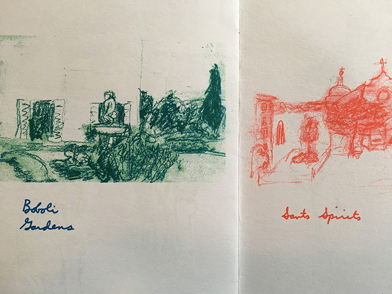 Drawing Florence is a sketch zine about a drawing trip through Florence, Italy. 10 pages. 5 x 7.75 inches. Multi-color Risograph Printing. Created by Amy Cheng.